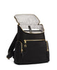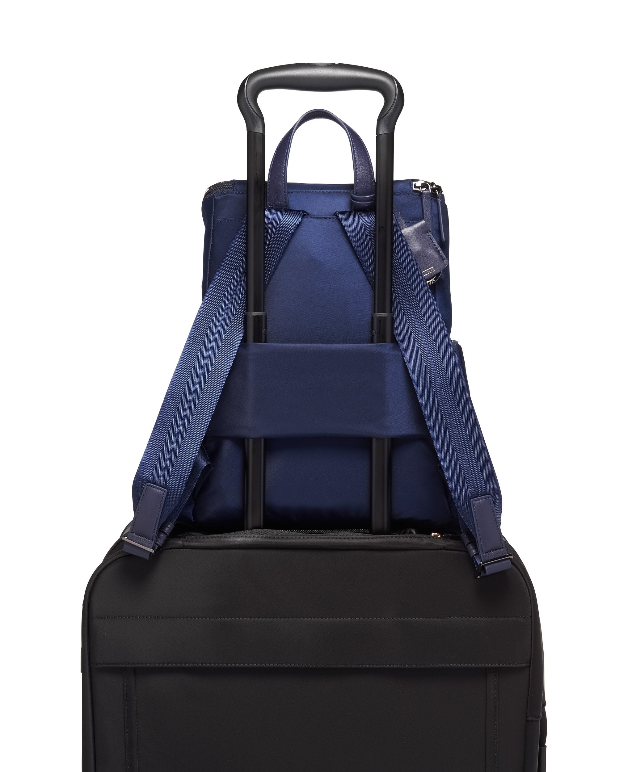 - Double-zip entry to main compartment, Single-zip front pocket with locking zipper pull, Double-zip side pocket with water-resistant water bottle pocket, Single-zip side pocket, Leather top handle, Add-a-Bag sleeve, Padded adjustable backpack straps, Padded tablet pocket with snap closure, Media pocket, 2 slip pockets, Zip pocket with TUMI Tracer, Pen pocket, Key leash