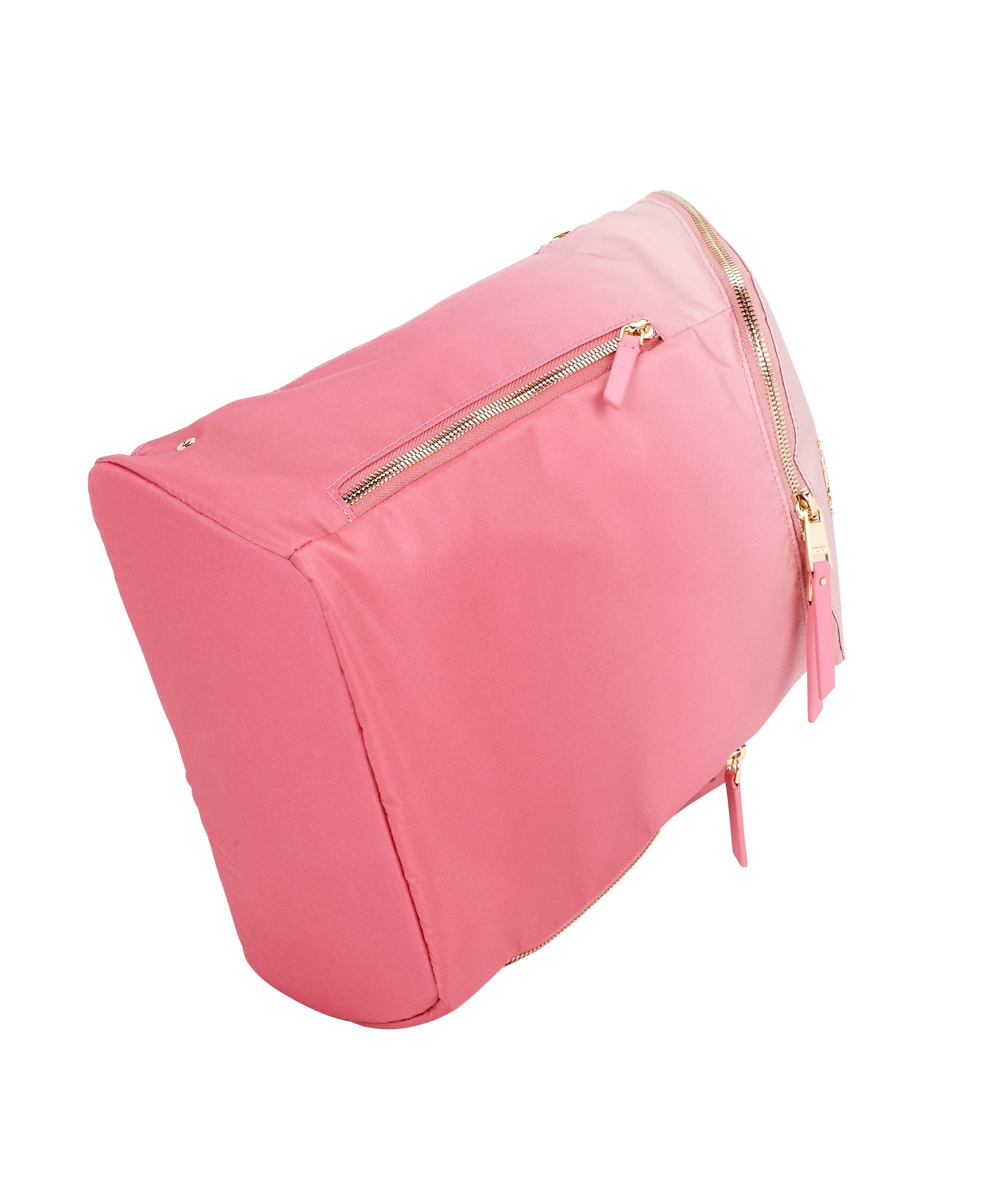 • Double-zip entry to main compartment, 2 front zip pockets, Quick-access phone pocket on back with magnetic snap, Zip-access to interior collapsible water-resistant water bottle pocket, Leather top handle, Monogrammable detachable leather dangler/key