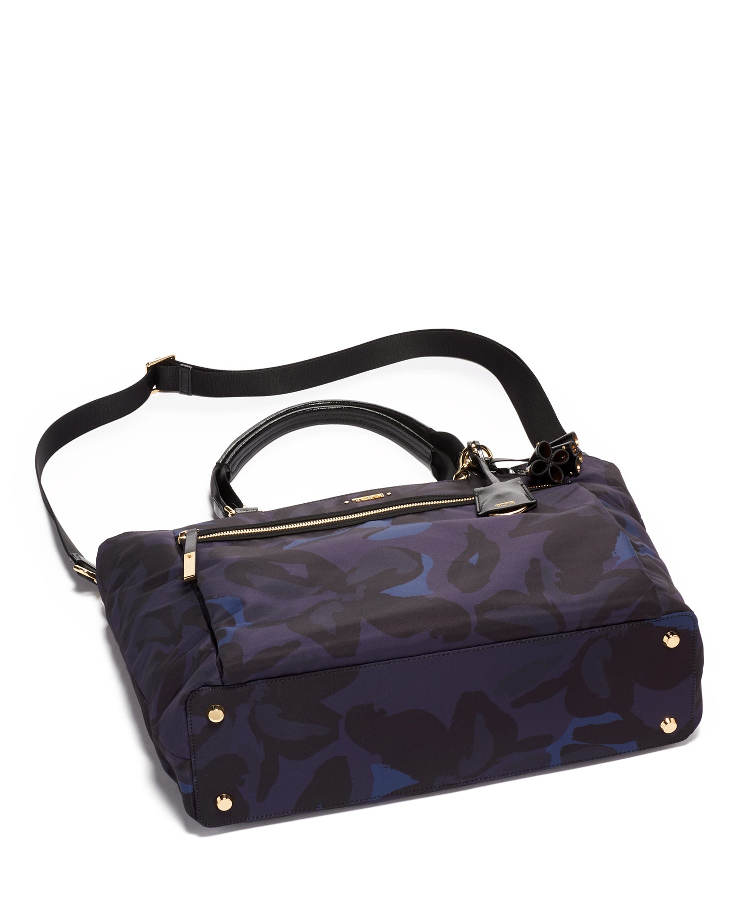 - Leather-trimmed carry handles. Removable adjustable shoulder strap. Monogrammable detachable leather dangler/key ring.
