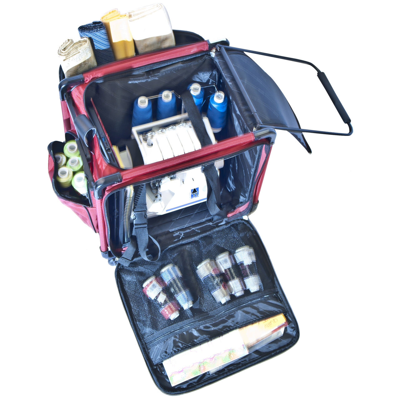 Serger On Wheels are designed for road/vehicle transport. Not recommended for airline check-in. This sturdy bag is good for your serger, a laptop, thread Treasure Chest, and sewing supplies, etc. The case fits most serger machines.