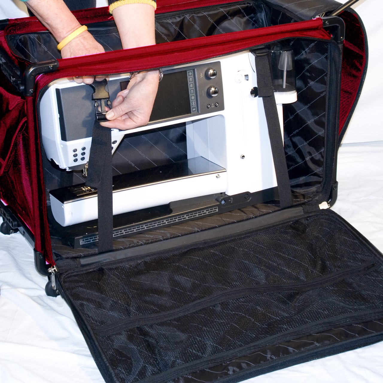 Award winning, medically endorsed case provides back-saving, lightweight transport of all sewing supplies. Top-Side-opening easy access, stable 4-wheel base, two inside straps to secure your machine, collapses to 3 for easy storage and stacks up to 100lbs.This machine case fits most airplan overhead bin(Domestic USA only, might not meet international regulation).
