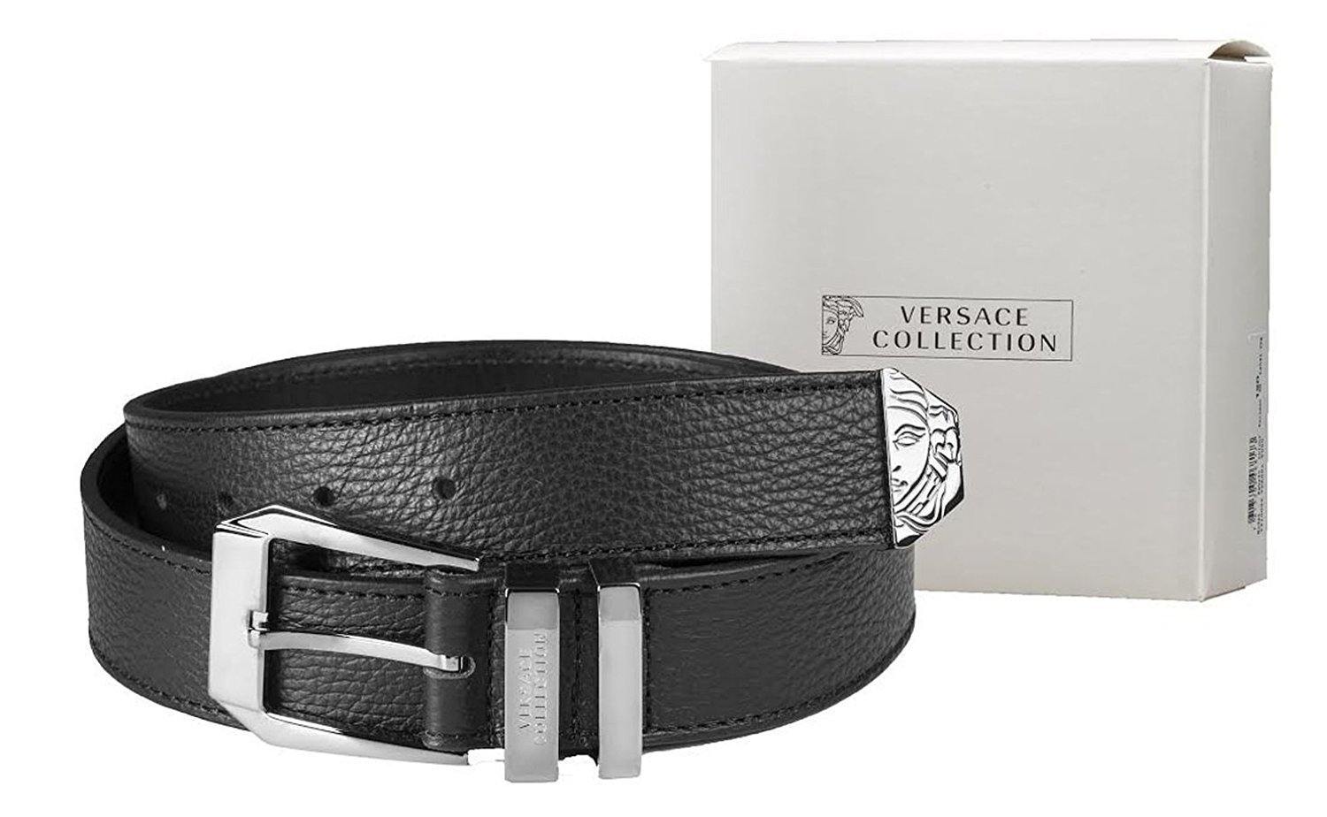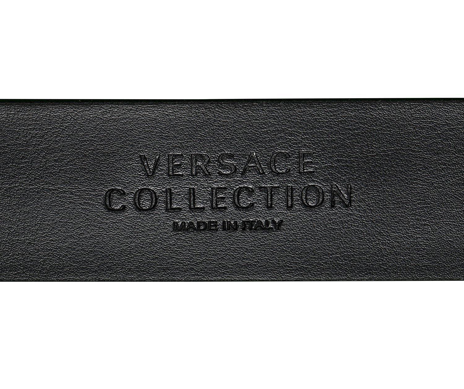 Versace Collection Men's Grained Leather Silver Medusa Logo Belt. V910144