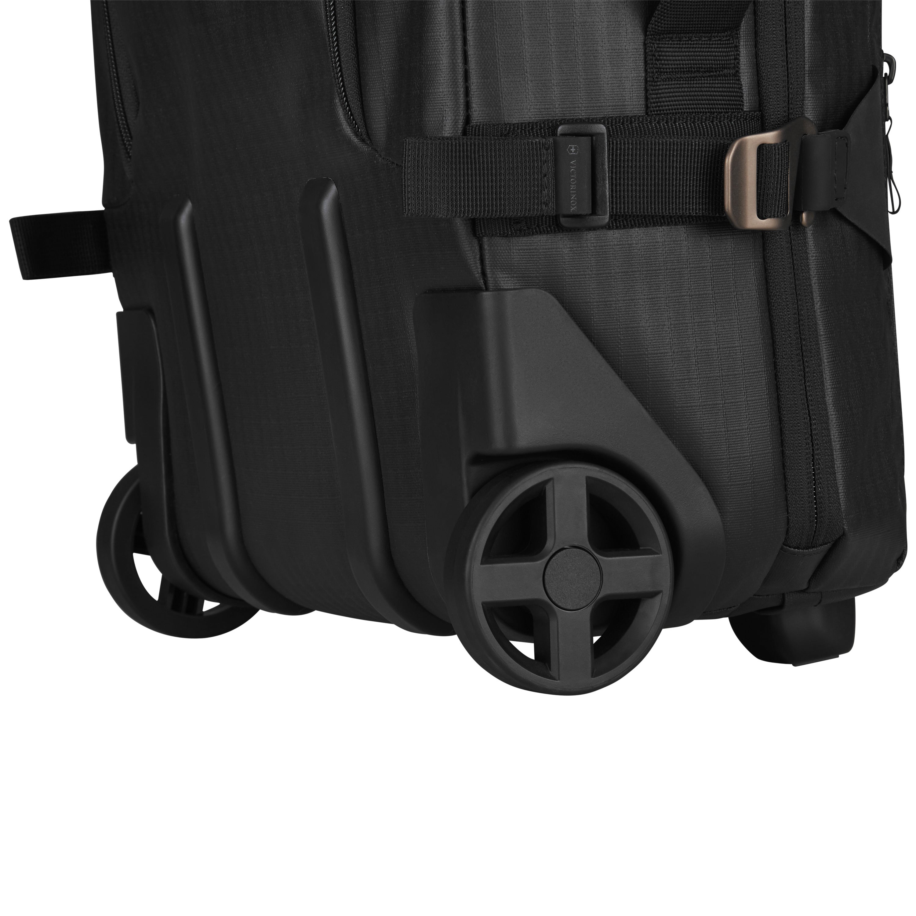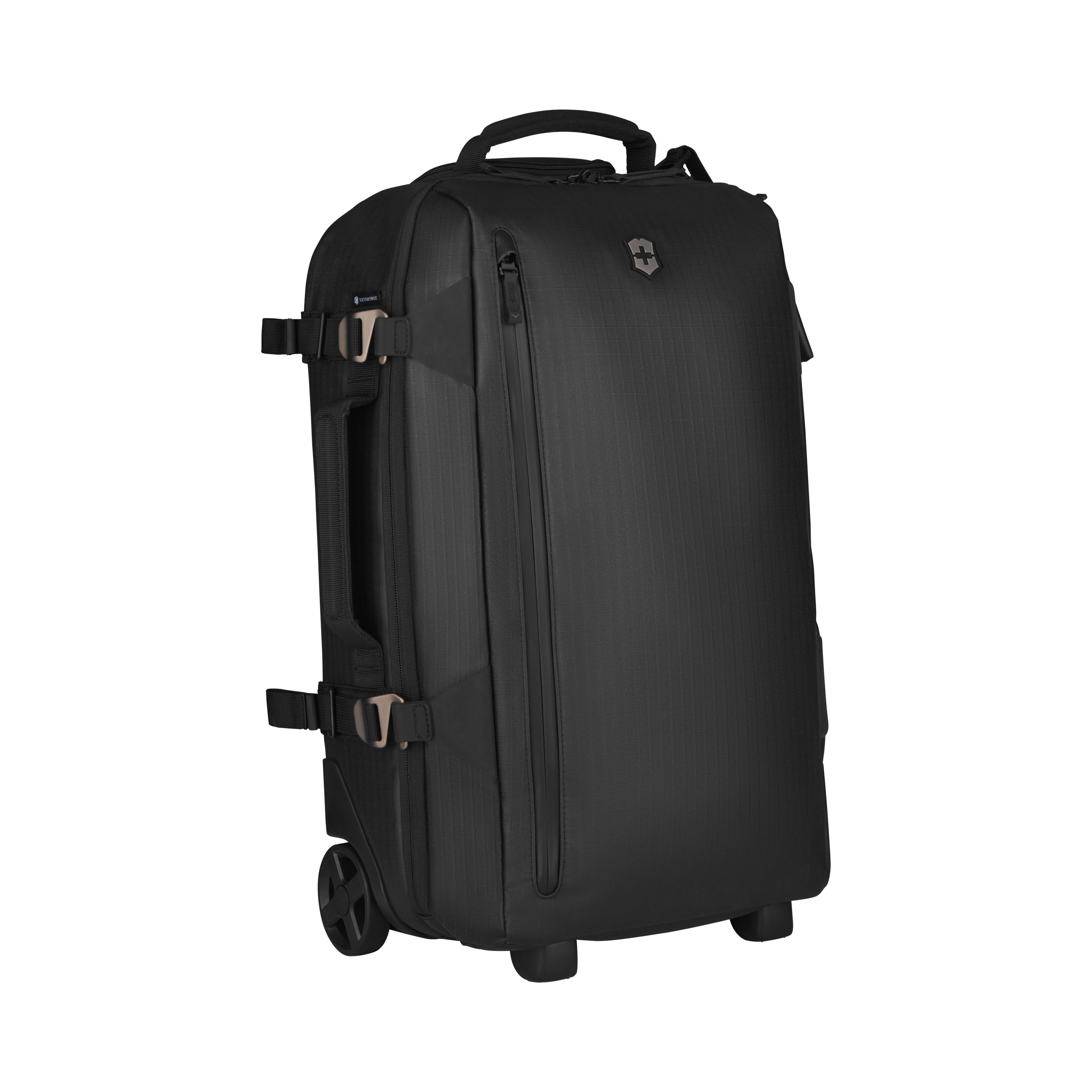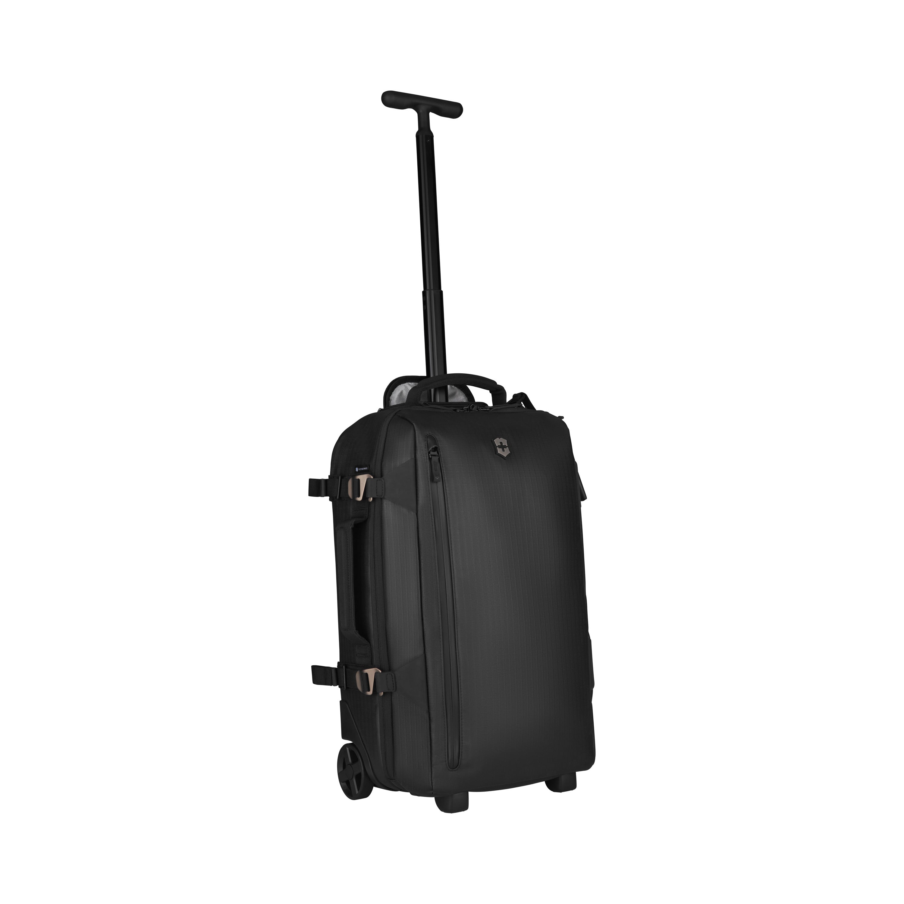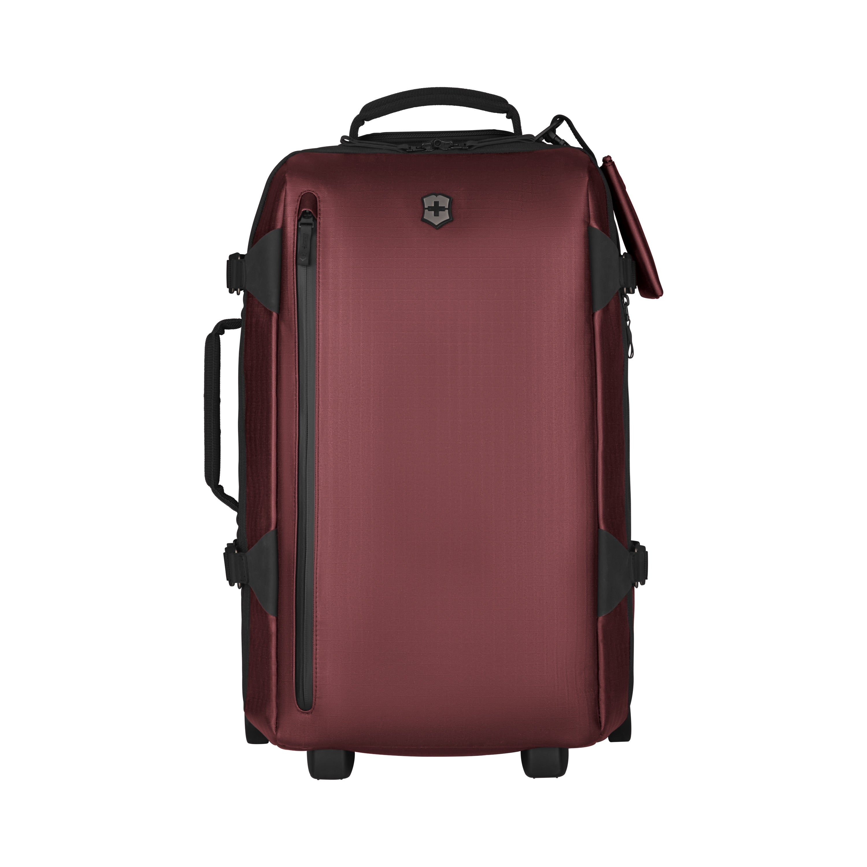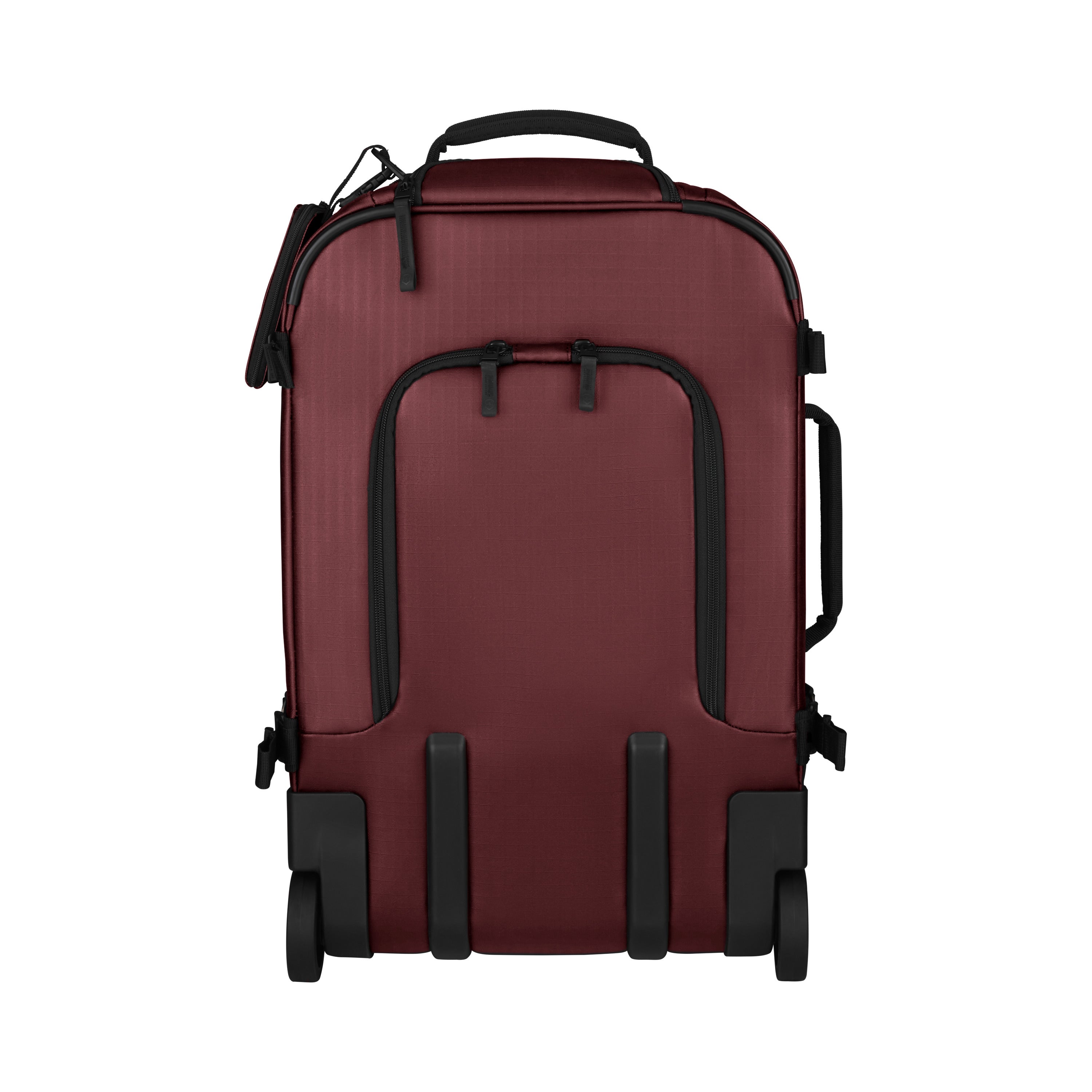 • The 2-in-1 wheeled duffel carry-on converts to a backpack and features padded, adjust-able shoulder straps that zip away when not in use.