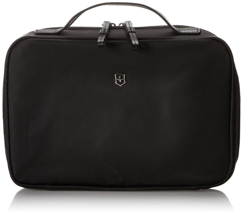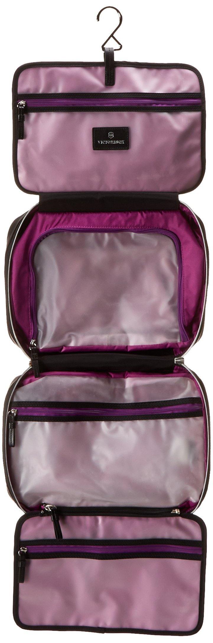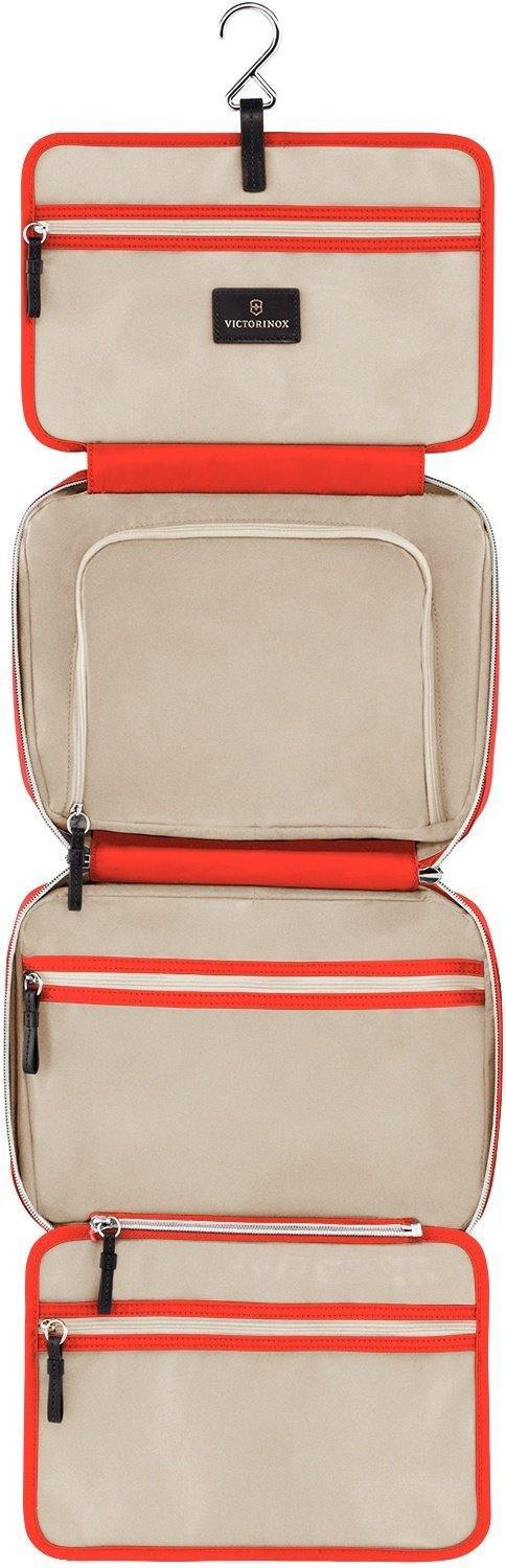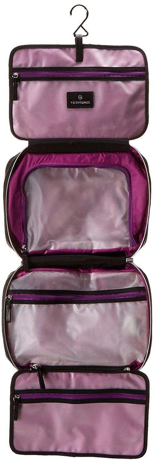 Keep your make-up and beauty essentials neatly organized. Offers plenty of space for full-size and travel-size bottles. Unfolds to give you four storage compartments. Top hook allows case to hang from a shower bar or towel rack. Water-resistant interior for easy cleaning. Convenient detachable zippered pouch is ideal for taking a few essentials with you on the go. Leather haul handles. Elegant silver hardware and leather touch points.