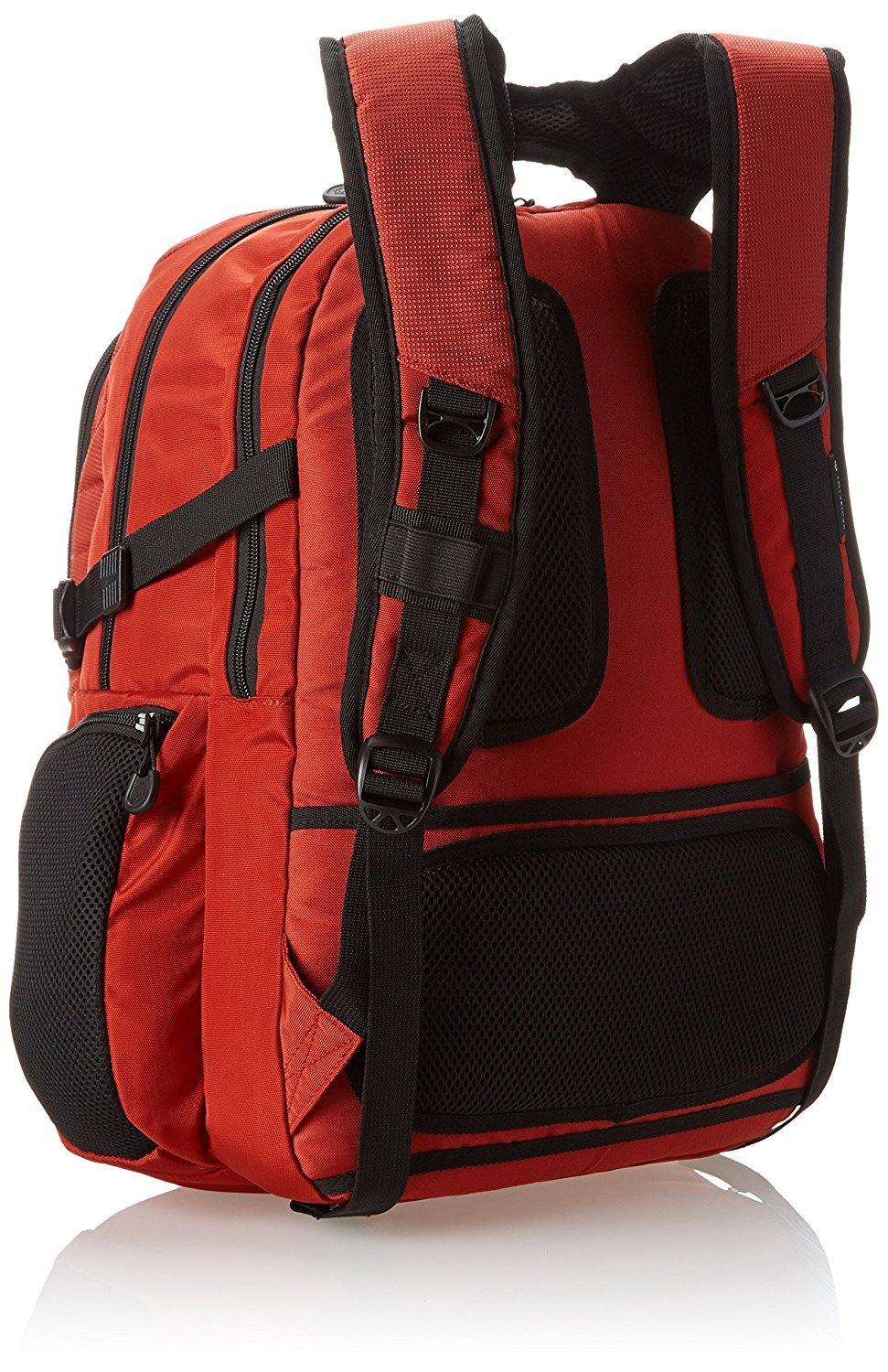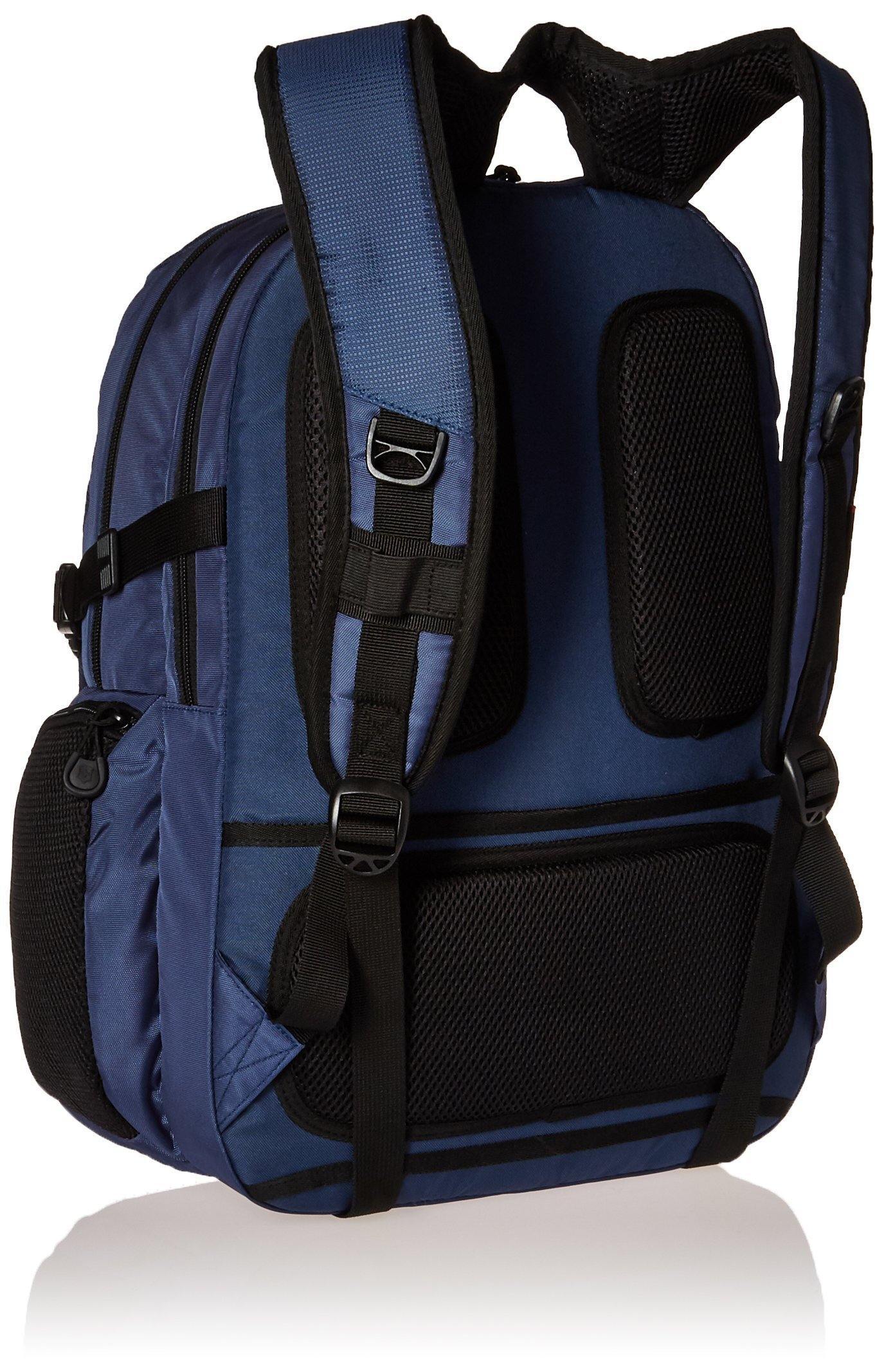 Color:Blue/Red Logo With ample room and sturdy construction, the pilotbackpack is ready for anything. Padded rear compartment with soft, anti-scratch lining holds up to a 16 inch (41 cm) laptop. 10 inch (25 cm) paddedportable electronic device pocket with soft, anti-scratch lining for a tabletor e-reader. Interior organization includes zippered mesh peripherals pocketand file divider. Front organizational panel includes full-length zipperedpocket, two electronics storage pockets, mesh pocket, pen loop and key fob.Exterior organization includes easy-access top zippered pocket and zipperedmulti-purpose mesh side pockets. Side compression straps cinch bag tostabilize heavy loads. Padded, adjustable shoulder straps. Padded back panelwith air-flow channels keeps the wearer cool for maximum comfort. Integratedgrab handle. Rear sleeve slides over the handle system of wheeled luggage foreasy travel with multiple bags