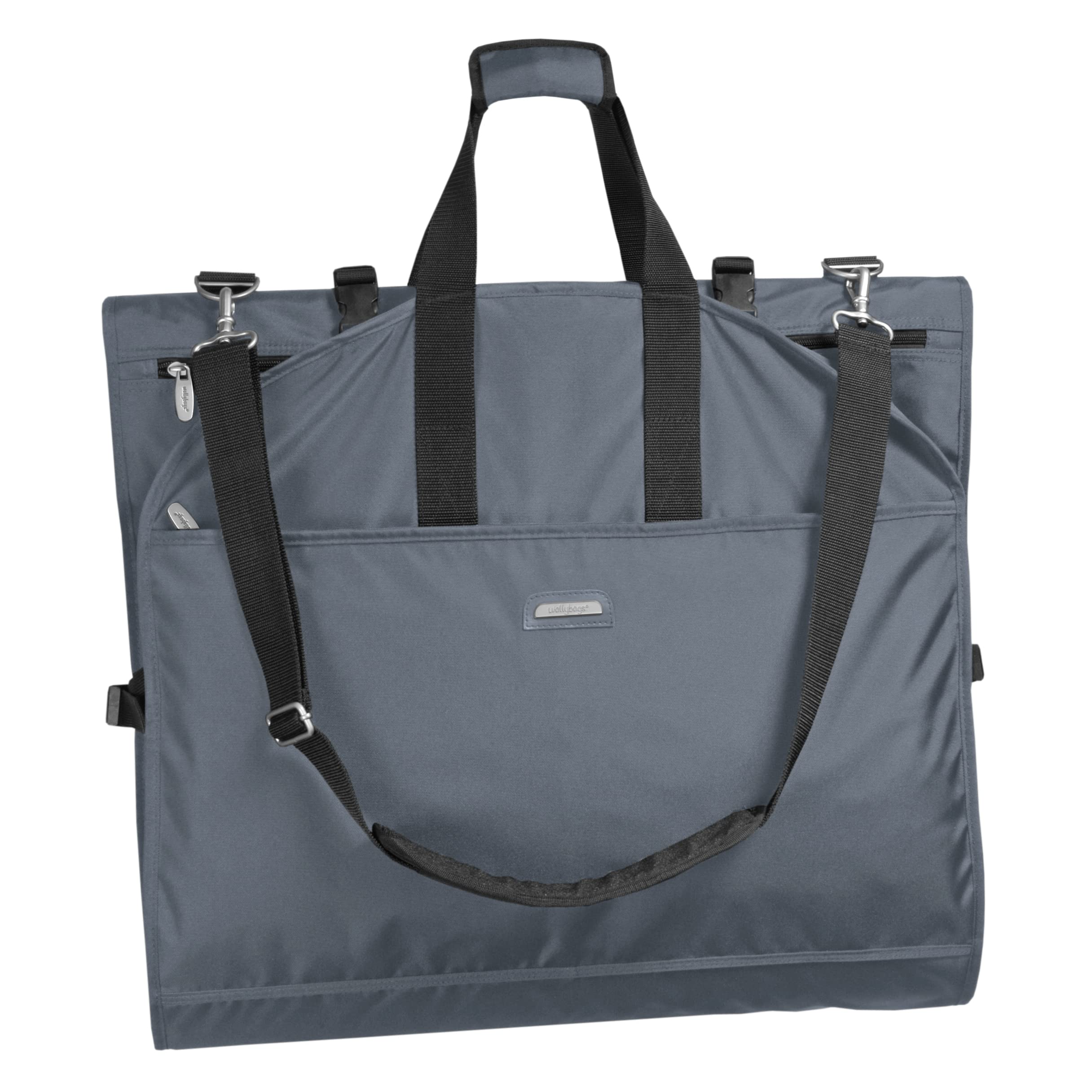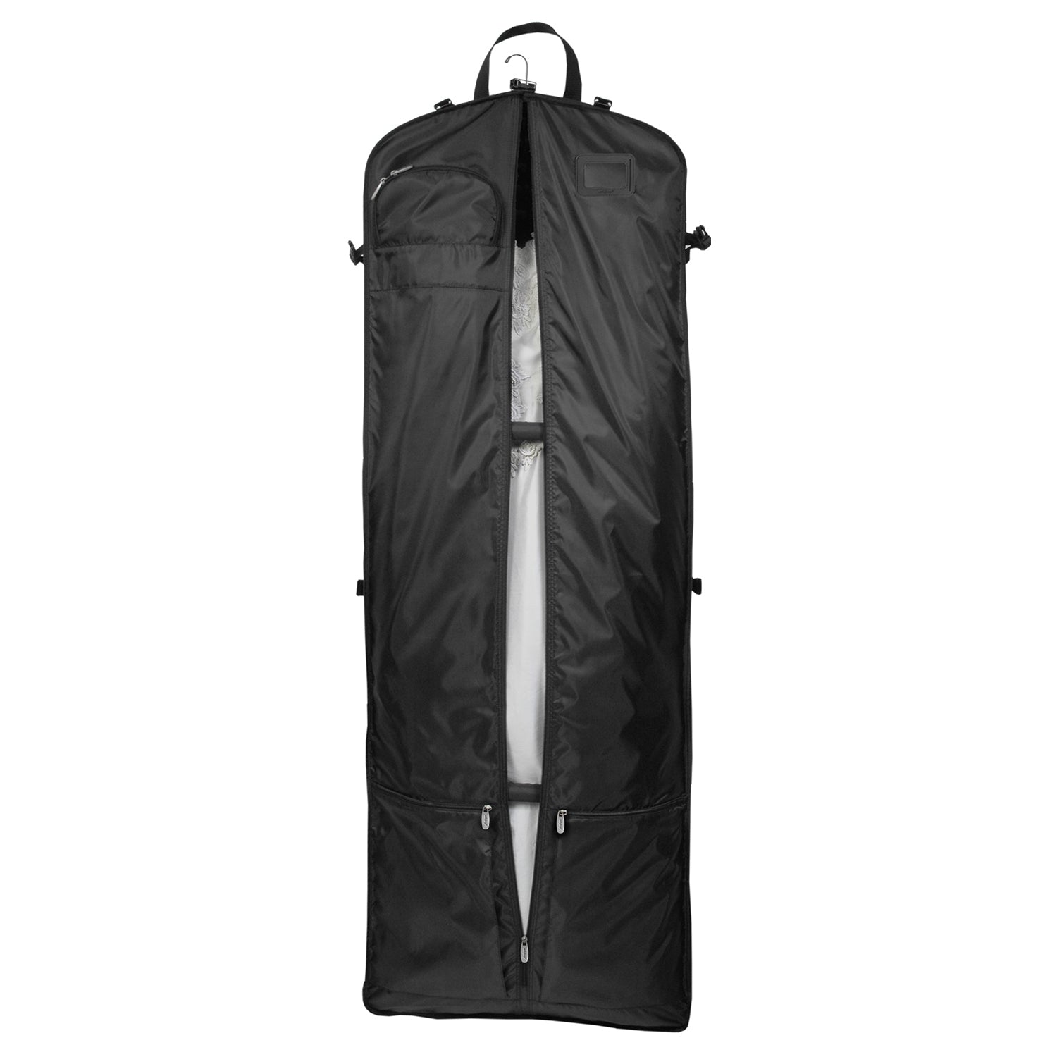 This 66-inch, floor-length gown bag protects delicate garments, such as a wedding dress and tuxedo, keeping them neat and wrinkle-free during travel. This bag is durable, fully lined and includes a shoulder strap, multiple pockets and patented WallyLock hanger clamp. The Wally clamp holds up to 6 hangers of any kind so clothes won't fall to the bottom of the bag.