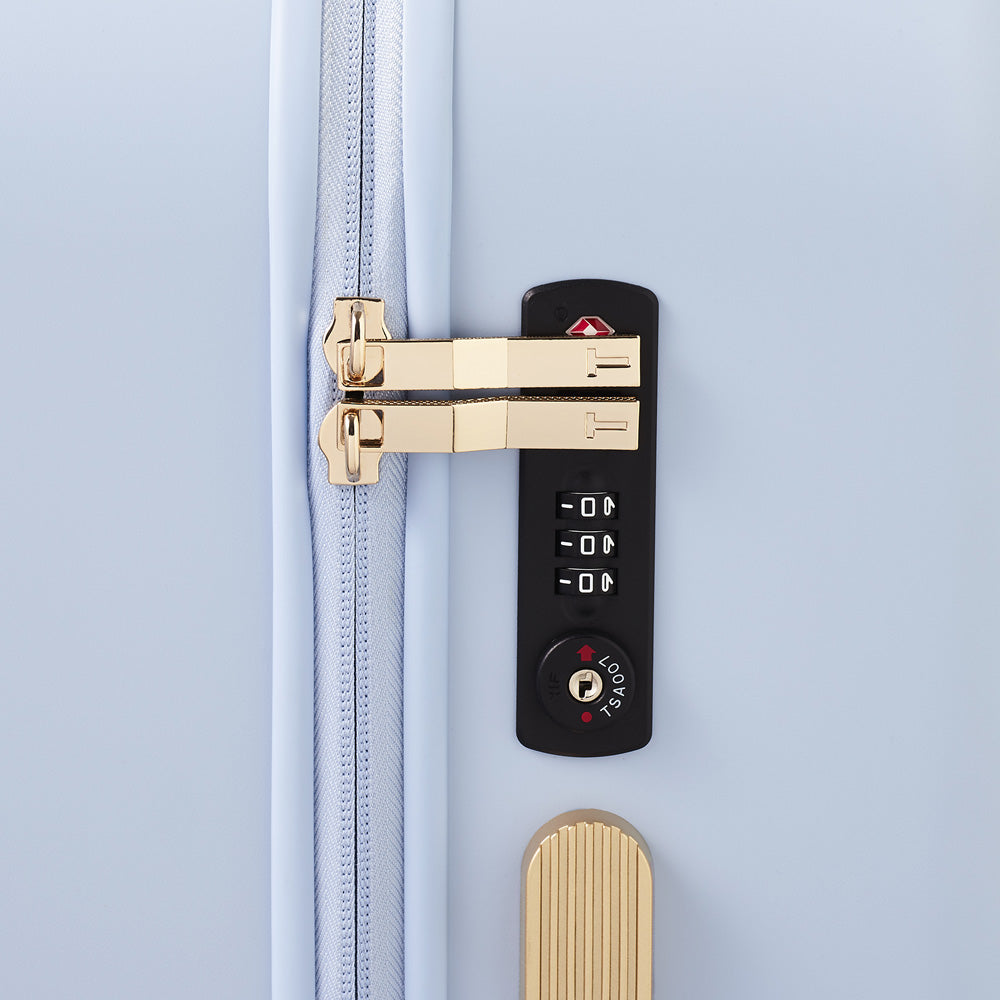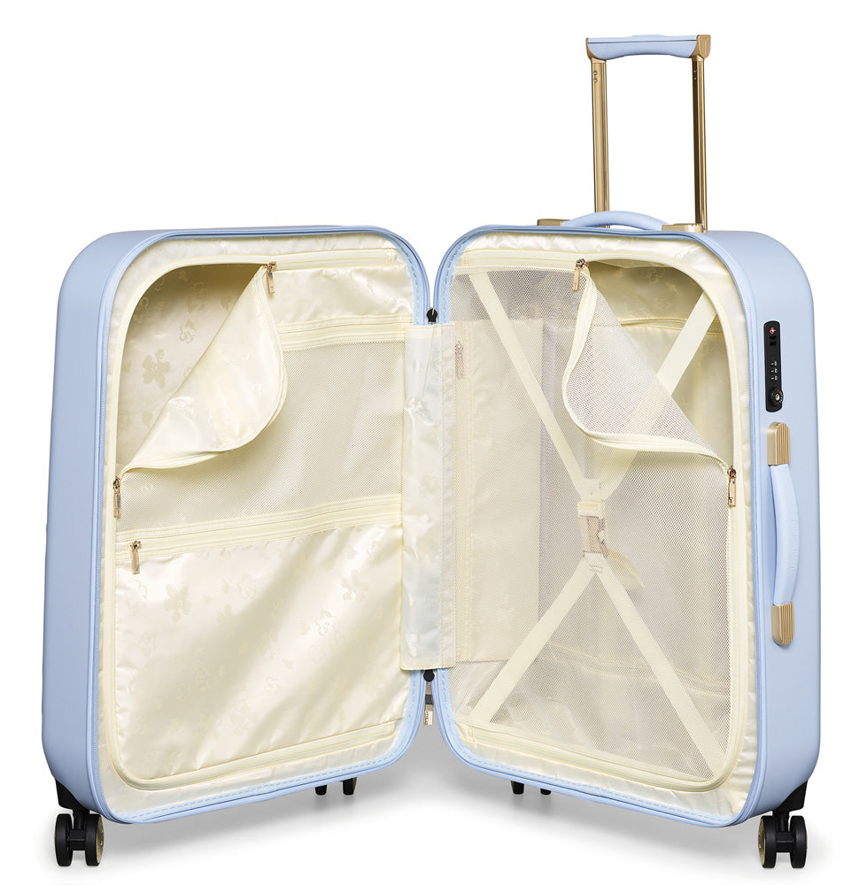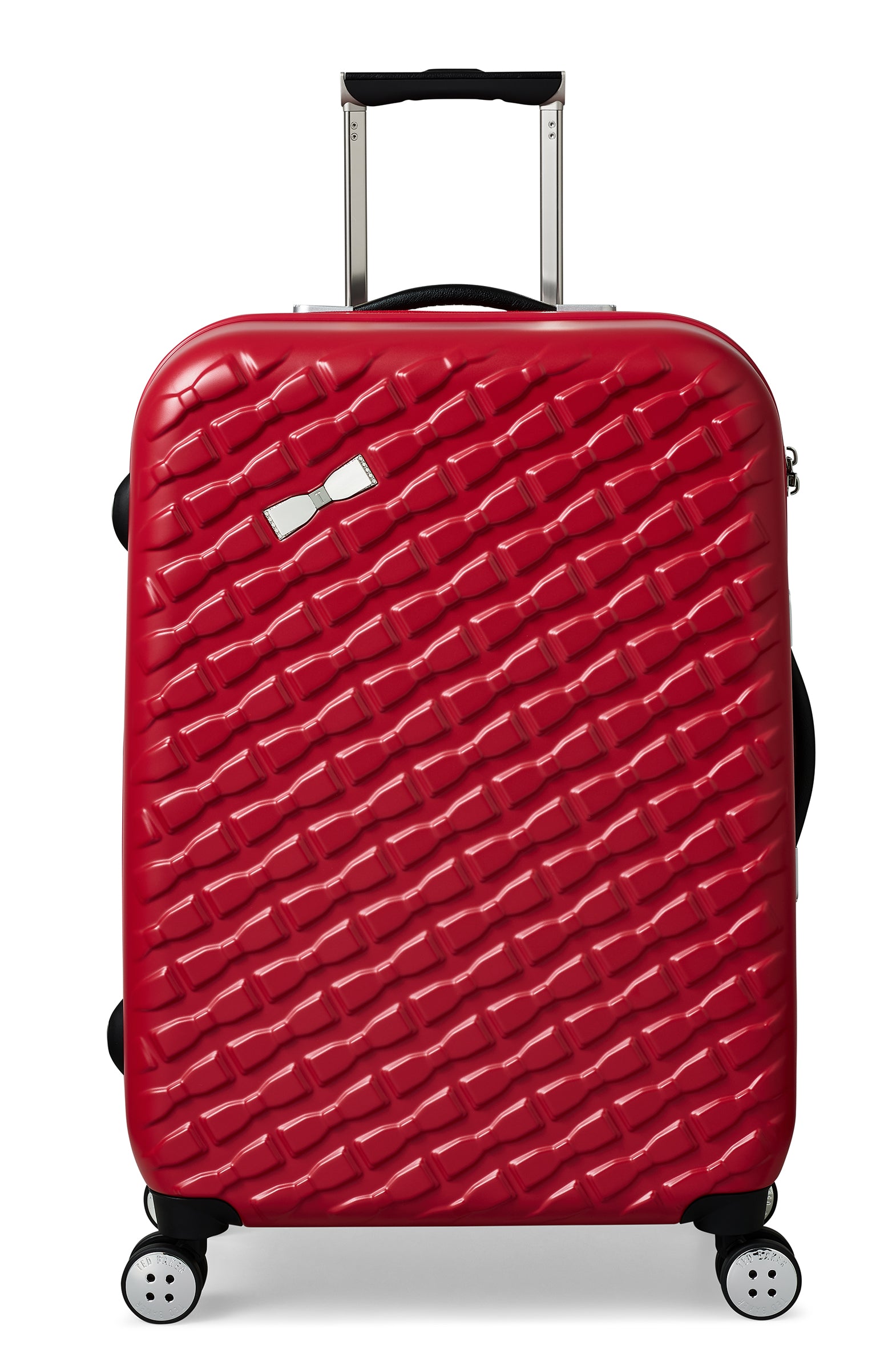 Our previous bestselling collection Beau has been given a facelift. This new silhouette features a contemporary repeat of raised bows in a new sleek shape with a single signature gold bow adding charm to the case. Paired with a redesigned trolley system with hidden push button, soft grip handle and discreet "T" logo. The case has a butteryfly style opening and is lined with a beautiful tonal bow jacquard lining.