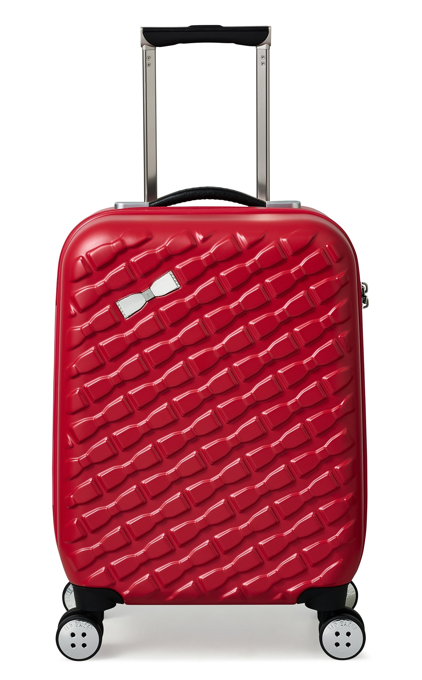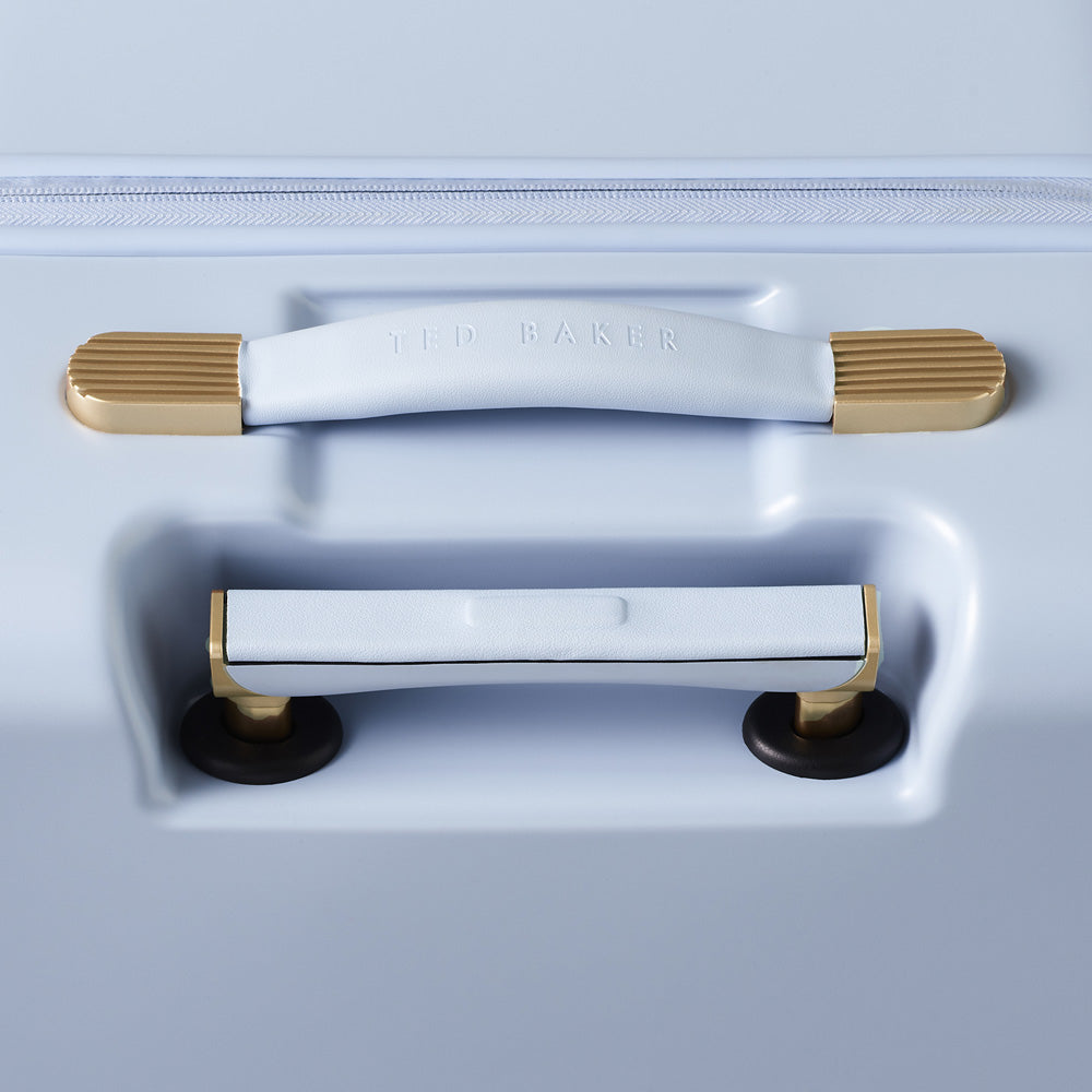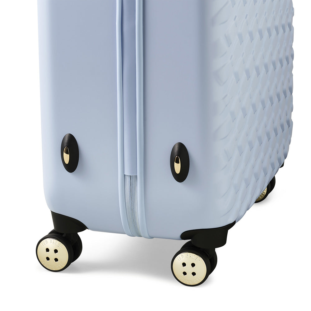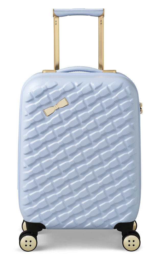 Our previous bestselling collection Beau has been given a facelift. This new silhouette features a contemporary repeat of raised bows in a new sleek shape with a single signature gold bow adding charm to the case. Paired with a redesigned trolley system with hidden push button, soft grip handle and discreet "T" logo. The case has a butteryfly style opening and is lined with a beautiful tonal bow jacquard lining.