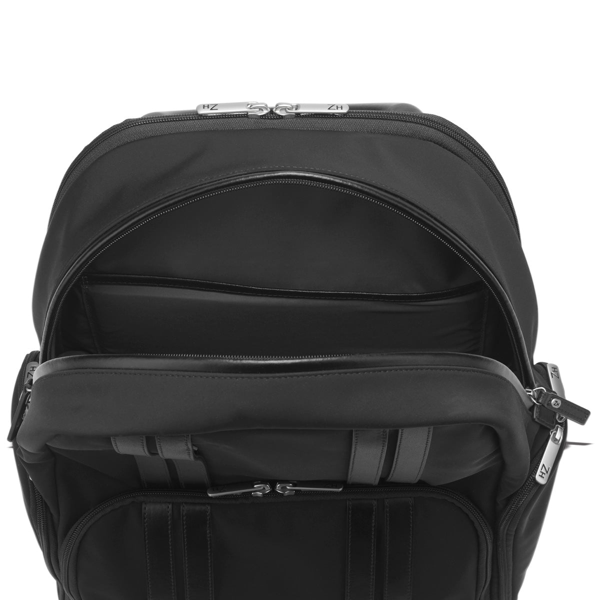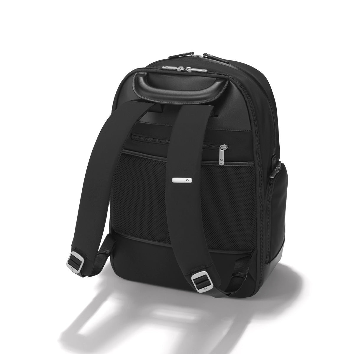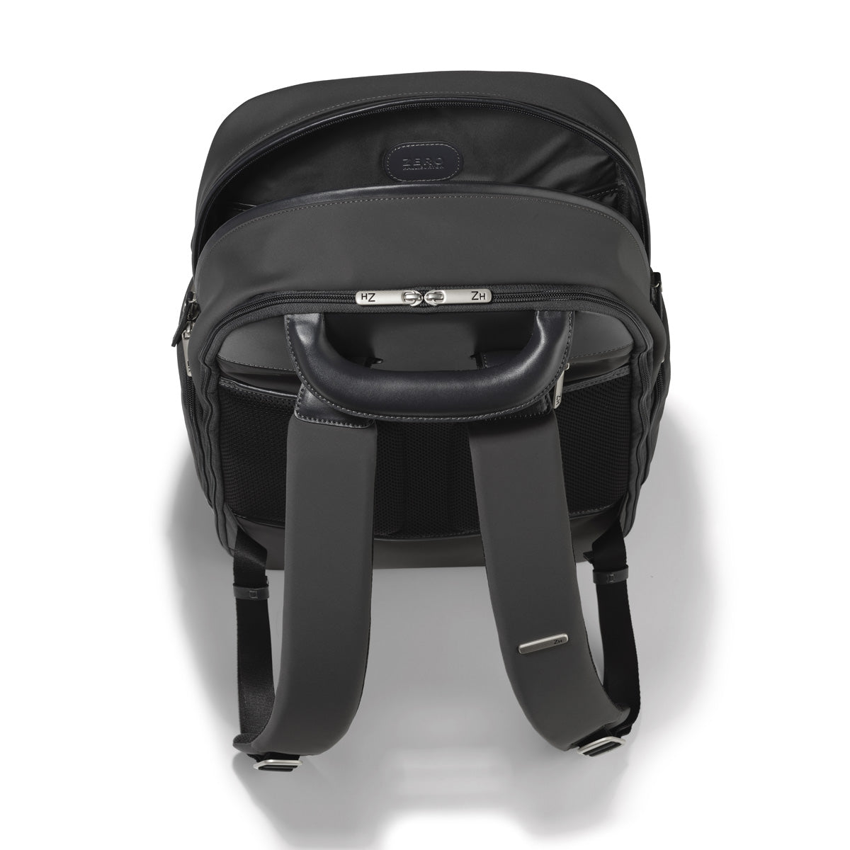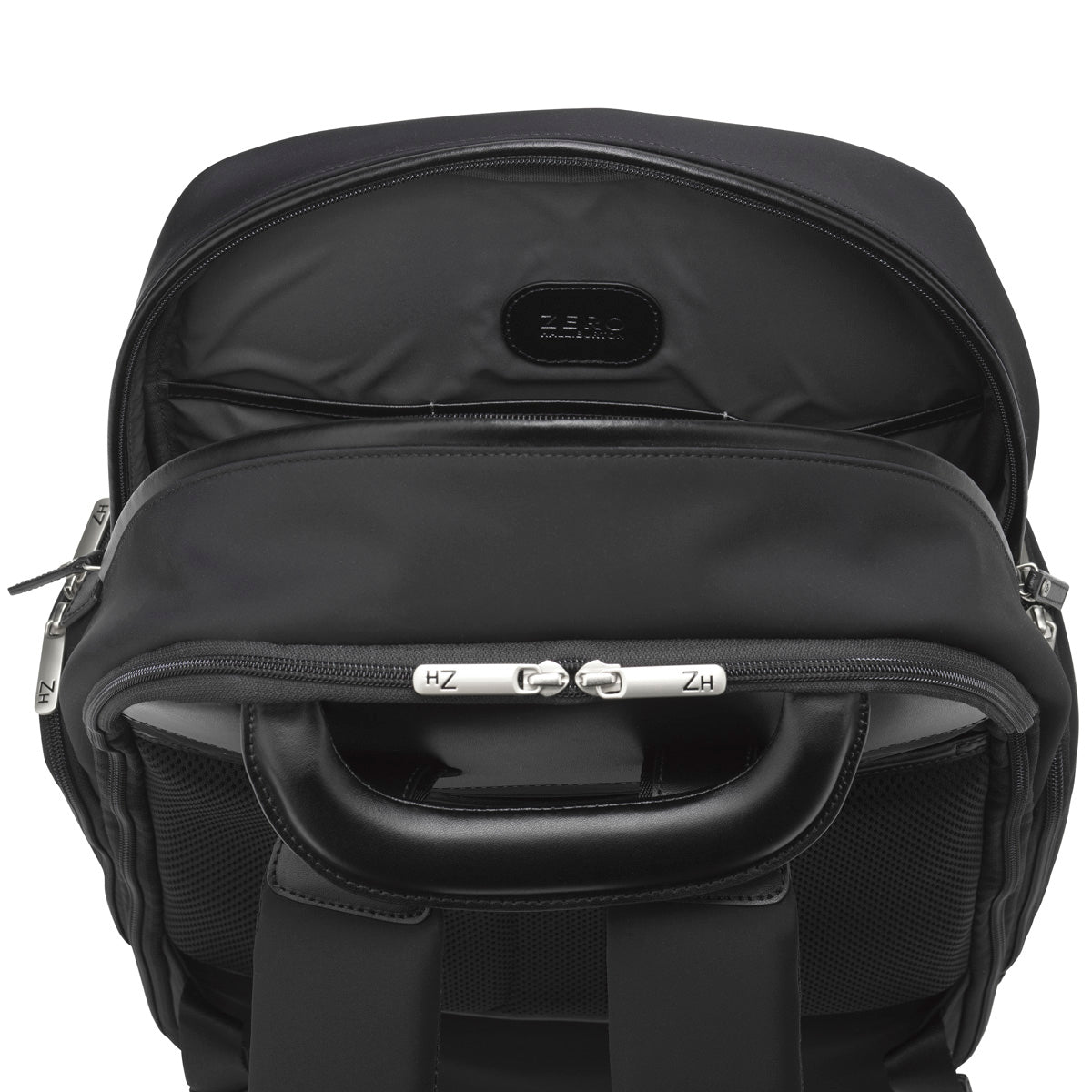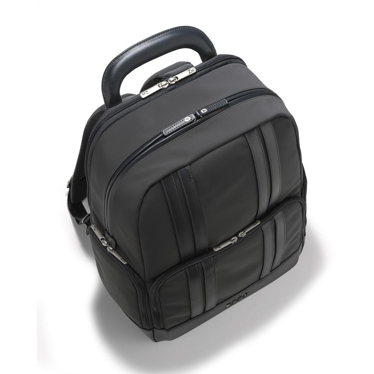 - Two stealth exterior pockets concealed under signature double rib design. High quality YKK chrome double zipper pulls and chrome buckles with laser-etched ZH monogram.